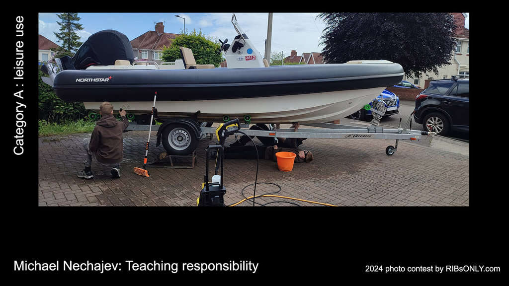 In the picture you can see my Northstar Orion 6, parked in the drive and my 13-year-old twins scrubbing the hull – one of them is lying under the boat. In the background – you can see me under the boat as well – leading by example.